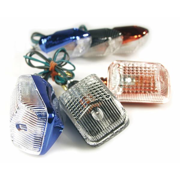 Die eloxierten Blinker von TNT werden seitlich an die Verkleidung geschraubt. Transparentes Glas, MaOeŸe 58x38x37.